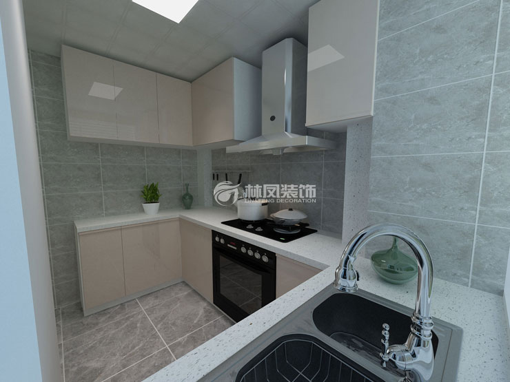 U型廚房,封閉式設(shè)計(jì),有足夠額儲藏功能,櫥柜門板的顏色和墻磚的顏色搭配到一起,是比較時尚的,并且比較好打理。