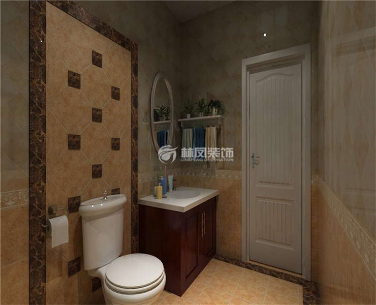 對于一個面積不大的衛(wèi)生間,浴室柜上方采用了一個小圓鏡子的搭配,節(jié)省空間,彰顯個性,馬桶后方采用了瓷磚拼花的造型凸顯墻面空間的立體,小小的衛(wèi)生間空間感一下就凸顯出來。