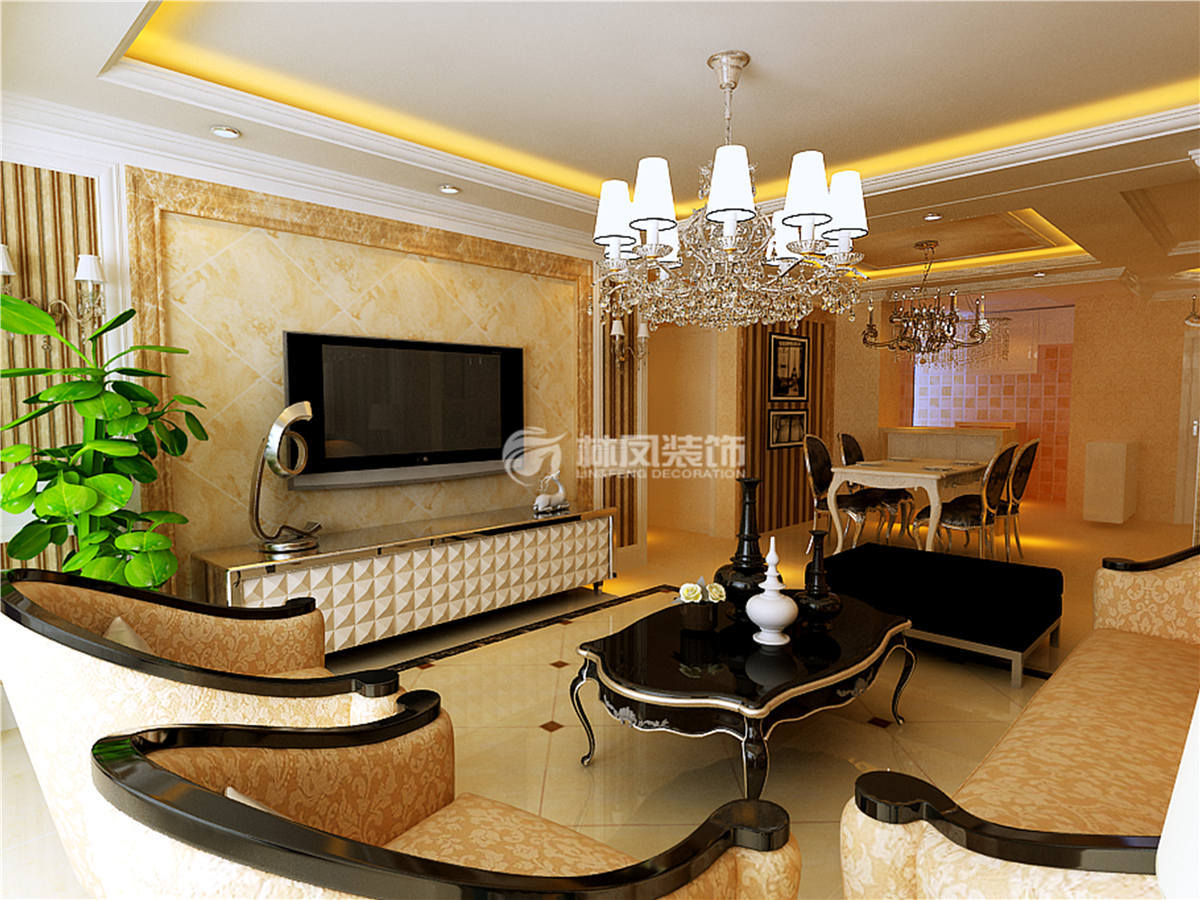 客廳說明:客廳墻面大面積運(yùn)用墻紙,地面運(yùn)用大理石,電視墻用白色木線勾勒出符合風(fēng)格的造型,使簡(jiǎn)歐的風(fēng)格體現(xiàn)的很別致,但是并不復(fù)雜水晶燈的搭配起到了畫龍點(diǎn)睛的作用,使整體的空間感更強(qiáng)!