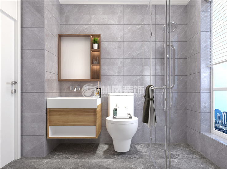 整體深灰色墻磚突出效果,表現(xiàn)的一體化。配備白色及原木色的潔具和浴室柜,顯得簡(jiǎn)單整體化。