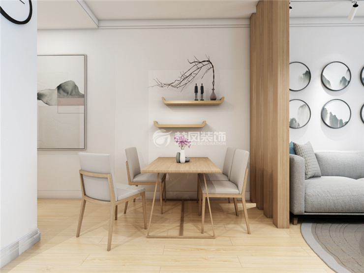 餐廳的墻面背景硬裝與客廳的樣式線條是一致的,在餐廳背景墻上設計了兩個簡單的置物隔板, 擺放上幾只枯枝,白色瓷瓶,寧靜自然之感立即體現(xiàn)。
