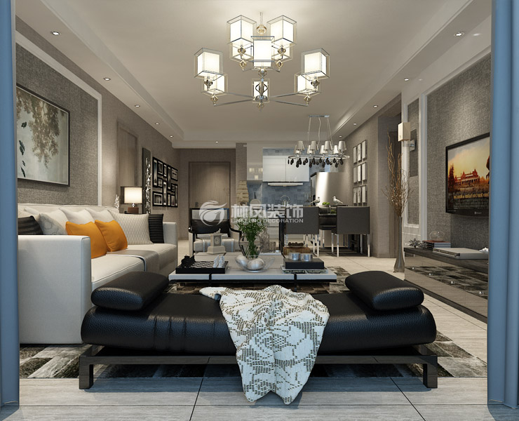 客廳棚墻面主要運用石膏板吊棚,且吊棚不是傳統(tǒng)的虛光吊棚,整體看上去簡單大方。墻面運用石膏板做造型區(qū)分墻面空間,墻面整體為灰色壁紙加深后現(xiàn)代風(fēng)格效果,門搭配的是暗木色,個人角色是扣題的顏色。