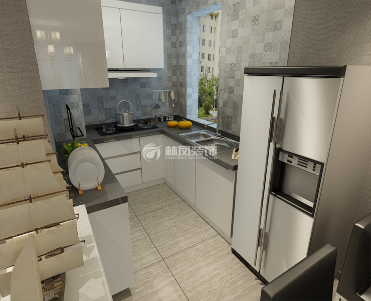 廚房為敞開式廚房,增加室內(nèi)空間感,墻面為灰色墻磚,即為敞開式廚房整體需要和客廳融為一體,所以廚房也是黑白灰的搭配,主要作用還是呼應(yīng)客廳,而且廚房對于年輕人來說U型廚房增加廚房使用率,是一個很浪漫的事情。