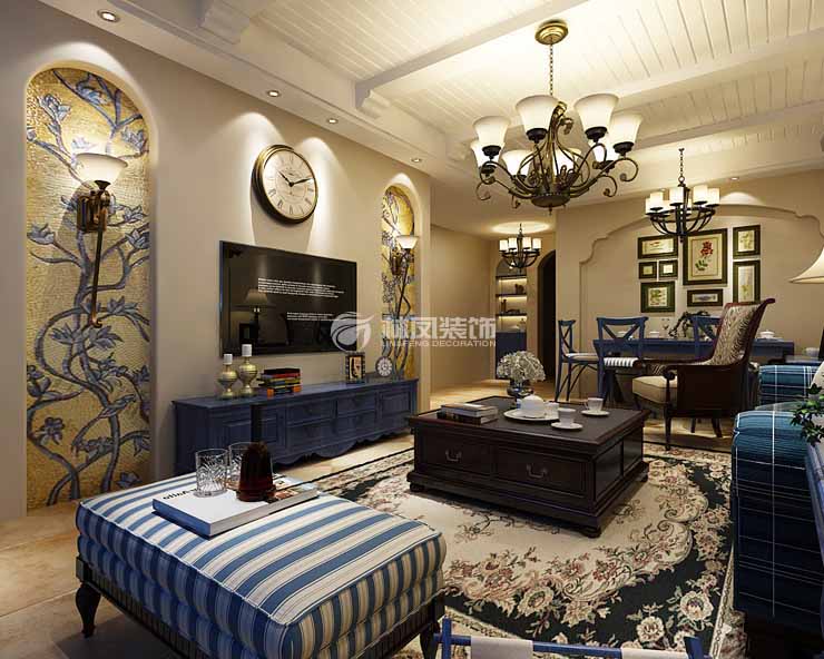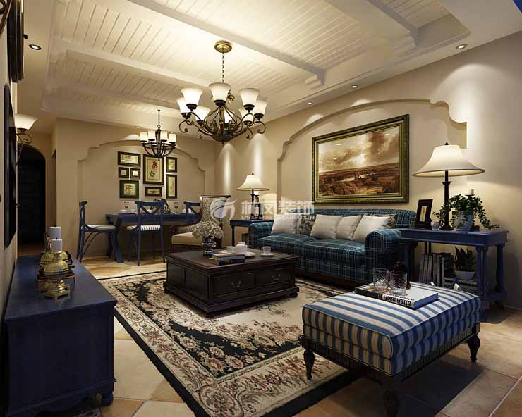 設(shè)計理念:本案是歐式中的一種比較清新浪漫的地中海風(fēng)格,石膏板假梁,抽縫的元素造型,讓大地黃的底色壁紙和海藍(lán)色的實木家居之間的搭配,來營造溫馨的爛漫的地中海情懷。
