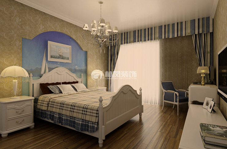 本案的臥室的床頭做了拱形的石膏板造型后,用大地黃色的印花壁紙鋪貼整體墻面,臥室的家具則采用了白色封閉漆實木,相反的軟裝配飾選擇可多變多換藍(lán)白條布藝。