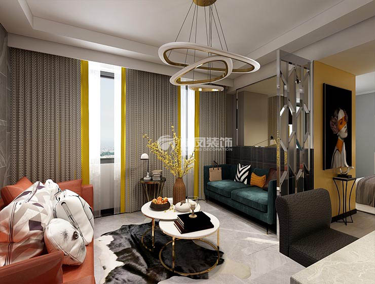 整個客廳空間充滿了現(xiàn)代感,不管是硬裝還是軟裝都是結(jié)合每個空間的色彩做出對應(yīng)的呼應(yīng),窗簾的拼接黃色,與愛馬仕橙色是最好的同色,也體現(xiàn)了主人的品味,奶牛地毯更是給整個空間增加了色彩。