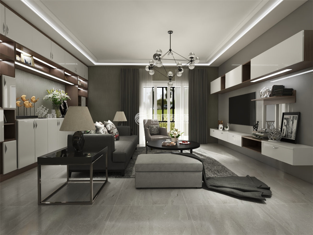 本案整體色調(diào)延續(xù)現(xiàn)代輕奢黑.白.灰三大對(duì)比色。大面積灰色以及白色與黑色的局部點(diǎn)綴使得整體空間科技奢華感十足。由于本案戶(hù)型空間較局促因此在客廳空間采取雙組合柜體結(jié)構(gòu),這樣的搭配使得空間使用率更高且不會(huì)對(duì)整體空間產(chǎn)生影響。