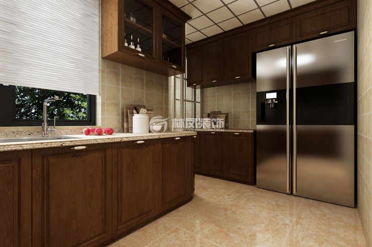 本案的廚房是采用了傳統(tǒng)美式的樣式,采用新型工藝制作,年代感完全突出出來。