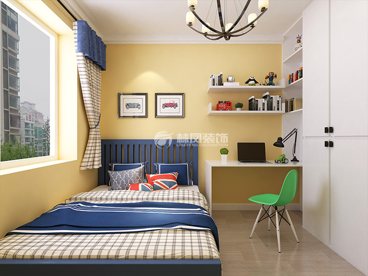 兒童房整體以溫馨童趣為主,淡黃色的墻體搭配藍(lán)色的床體與白色的衣柜書桌在搭配上一把綠色的小椅子整體顏色非常的豐富多元化,搭配上暖白色網(wǎng)格形狀的床品與窗簾使得兩者遙相呼應(yīng),可以讓孩子有一個非常溫馨舒適而又有趣的童年。