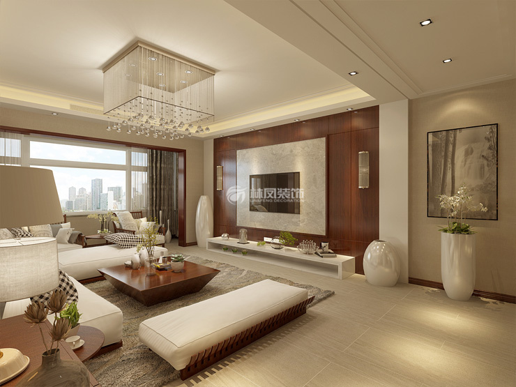河畔公館254平4居室現(xiàn)代風格林鳳裝飾的客廳采用直線邊棚,利用筒燈的點光源和吊燈的散光源營造出一個舒適的光影效果??蛷d的背景墻選用雙拼色,白色部分與沙發(fā)、電視柜色彩相呼應。墻面的裝飾畫和燈具起到了畫龍點睛的作用。
