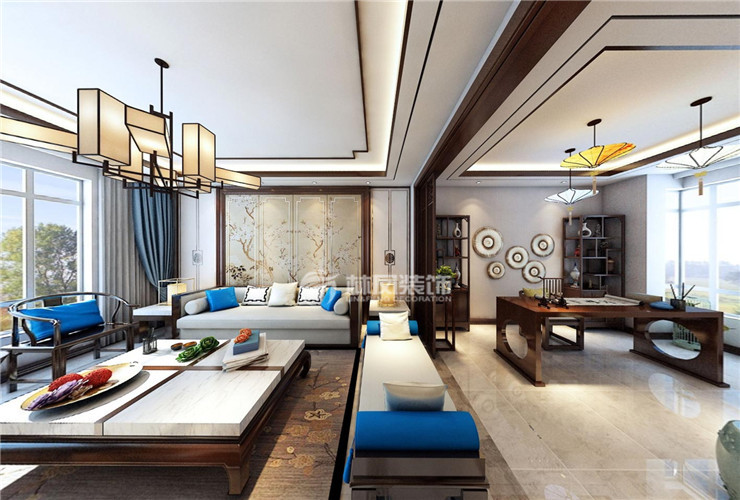 碧桂園太陽城360平3居室中式風(fēng)格林鳳裝飾的餐廳、客廳南北通透,由于開間較大,結(jié)合簡(jiǎn)單辦公功能的多功能廳,在格局和功能上為戶型添加親人的互動(dòng)氛圍。