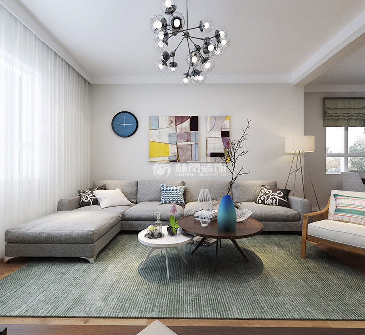 綠城全運(yùn)村116平2居室北歐風(fēng)格林鳳裝飾的客廳整體墻面白色乳膠漆 提亮整個(gè)空間的明亮度。淺灰色的沙發(fā)搭配灰綠色地毯 彰顯整體高級(jí)的視覺沖擊力。
