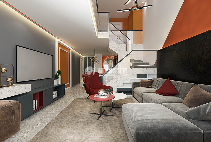 長(zhǎng)島壹號(hào)50平1居室現(xiàn)代輕奢loft林鳳裝飾的客廳部分為整體空間挑空的主要區(qū)域 護(hù)欄 摒棄了 傳統(tǒng)的 鋼木或?qū)嵞镜臉翘莘鍪植捎昧虽摶Aё鳛?扶手 使得整體空間更加通透也起到了防護(hù)的作用,沙發(fā)背景用愛(ài)馬仕橙 提升空間的 色彩亮度 。