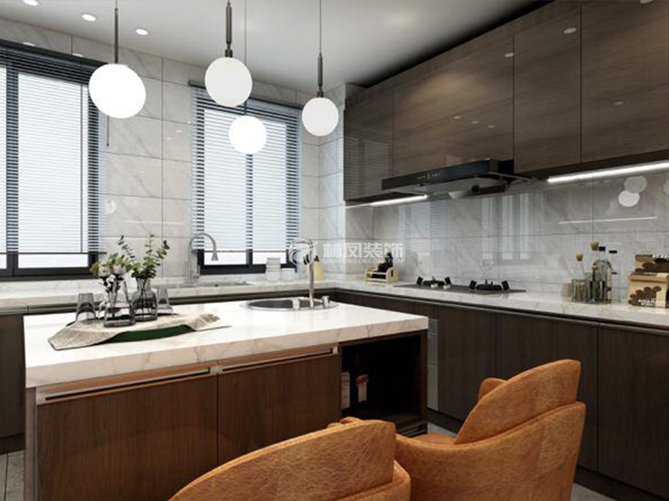 佳和新城97平2居室現代風格林鳳裝飾的開放式廚房選用長方形島臺,增大了空間利用率,并且島臺可以作為餐桌來使用,島臺上留有小型洗菜盆,可以作為簡單的操作臺。