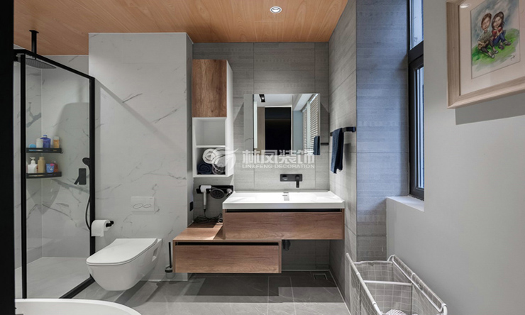 友誼城青蘋果102平2居室新中式風(fēng)格林鳳裝飾的衛(wèi)生間是白色和灰色相結(jié)合的瓷磚,搭配原木色的浴室柜,干凈利索,更加舒適。