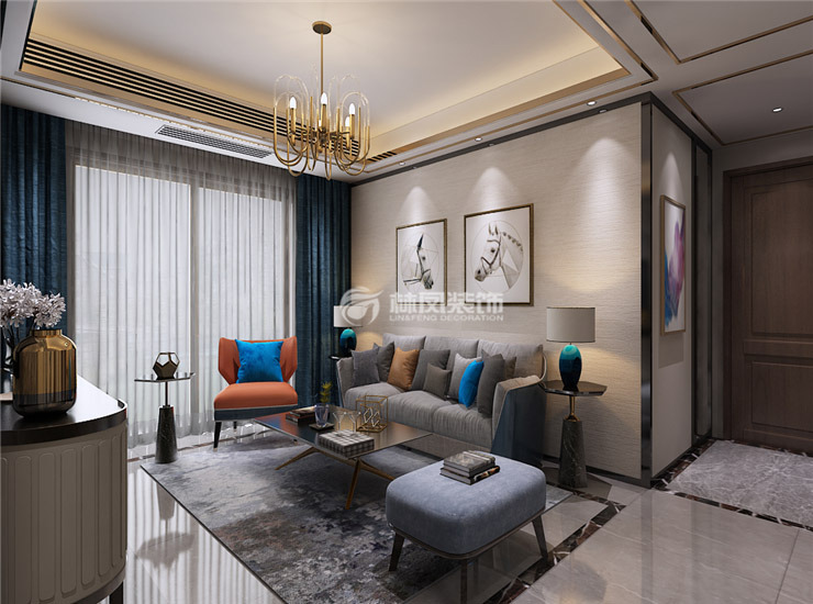 客廳采用灰色沙發(fā)顯得很有內(nèi)涵,沙發(fā)上藍(lán)色跟橙色靠墊也是醒目突出。對(duì)應(yīng)客廳才用的是直線造型棚搭配金屬收邊,充分的體現(xiàn)了輕奢的特色。沙發(fā)背景墻采用的是壁紙,壁紙很好的跟沙發(fā)做了呼應(yīng),兩幅裝飾畫很有品質(zhì)感。金色的吊燈也跟吊頂很呼應(yīng)。