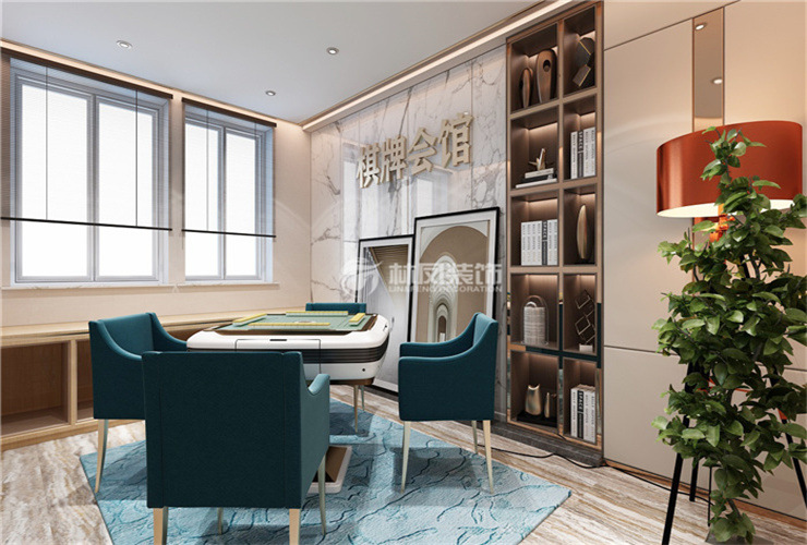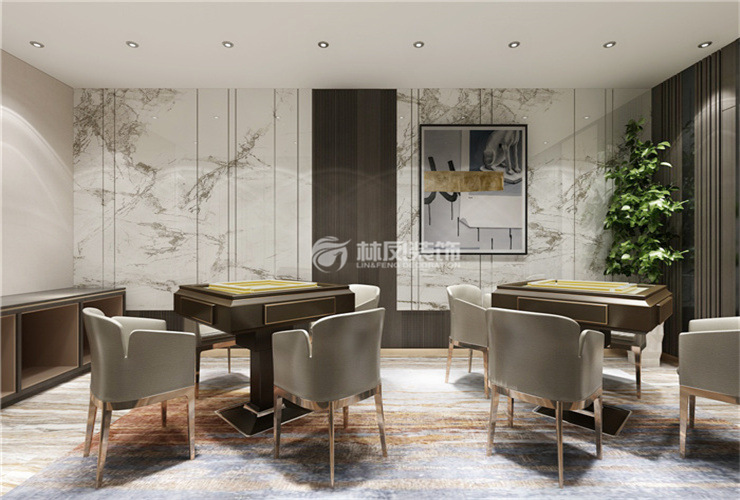 棋牌會館340平混搭風格林鳳裝飾的大廳以暖黃色為主,為了給客人一樣賓至如歸的感覺。墻面幾何造型非常具有現(xiàn)代感,臺球桌裝飾效果明顯,不拘泥于傳統(tǒng),別出心裁。