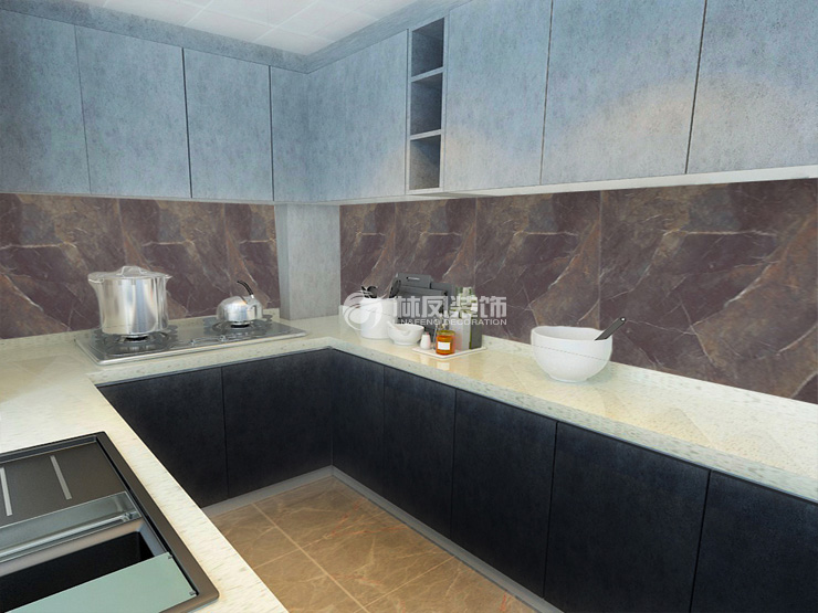 保利香檳國際89平三廳二廳現(xiàn)代風格林鳳裝飾的廚房櫥柜U型設(shè)計分區(qū),使整體櫥柜連貫清晰,提高利用率及方便業(yè)主使用,柜門采用上百下黑分體顏色。墻面防理石瓷磚是整個空間干凈簡潔。