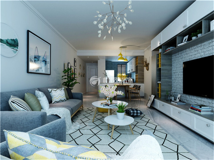 碧桂園鳳凰城130平三室兩廳北歐風(fēng)格林鳳裝飾的客廳電視背景墻上的設(shè)計是為了滿足女業(yè)主大面積儲物為主的設(shè)計,采用了左右對稱及二八定律的設(shè)計理念,既有儲藏空間也不顯著很悶。