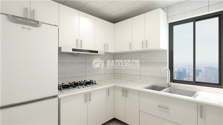 金輝優(yōu)步湖畔115平四室兩廳現(xiàn)代簡約風格林鳳裝飾的廚房空間運用了L型櫥柜,米白色的櫥柜搭配白色石英石臺面和淺色系色瓷磚互相呼應使廚房空間寬敞亮堂,廚房是做飯的區(qū)域,光線需要明亮一點才好,所以廚房更多的采用淺色系。