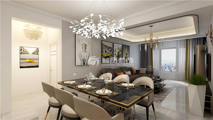 金輝優(yōu)步湖畔115平四室兩廳現(xiàn)代簡約風格林鳳裝飾的客廳以灰色和黑色進行銜接,客廳地面選用灰色的地磚與棚面采用了吊棚含燈帶部位加上了金屬線條,采用深灰色布藝沙發(fā)和灰色背景墻整體設計上都要求給人帶來大氣簡約又很內(nèi)斂的感覺,簡約的空間布局讓人感覺更加通暢。