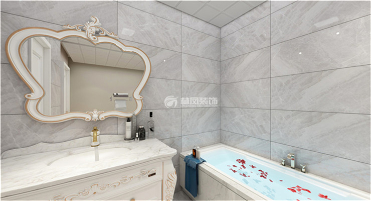 金地樾檀山180平四室兩廳歐式風(fēng)格林鳳裝飾的衛(wèi)生間墻面采用灰色,使空間看起來更為明亮,洗面臺風(fēng)格和客廳里的家具風(fēng)格相同,奢華且實用,讓衛(wèi)生間看起來非常通透。