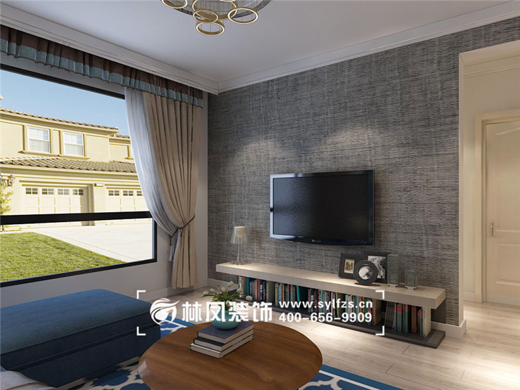 客廳中最重要的是沙發(fā)和電視柜,搭配整個空間需要設(shè)計(jì)師大膽的配色,沙發(fā)采用藍(lán)色的布藝沙發(fā),原木的圓形的茶幾,藍(lán)色和白色的地毯,讓空間大跳躍,白色的電視柜放一些自己喜歡的書,一是讓整體增加儲物空間,二是讓電視柜也成一個書柜,彰顯業(yè)主的身份。