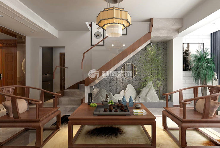 錦繡觀邸170平四室兩廳新中式風格林鳳裝飾的客廳里有理石踏步的樓梯,樓梯下做景觀,配合上燈光,將客廳的氛圍感體現(xiàn)出來,然后沙發(fā)背景用的是實木護墻板裝飾,體現(xiàn)出大氣的感覺。實木的中式圈椅分別置于兩側(cè),新中式的感覺油然而生。