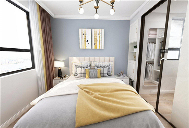 融創(chuàng)沈陽府125平三室兩廳現代簡約風格林鳳裝飾的臥室床頭采用了裝飾性壁紙鋪貼,與床質感形成對比,稍重的色彩設計,更利于睡眠空間,主臥空間較小,想達到大的收納要求,所以設計了一款透明款的衣帽間拉門設計,顯得空間更大。