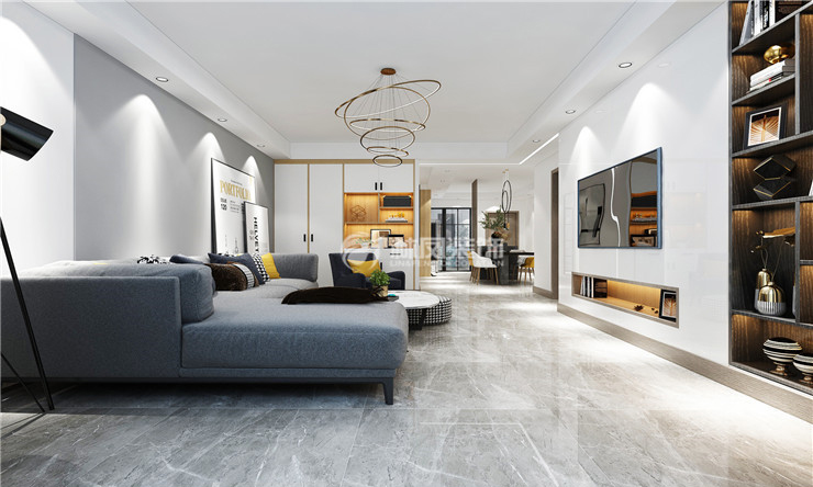 月星國際120平三室兩廳現(xiàn)代風(fēng)格林鳳裝飾的客廳大理石電視墻簡約肅靜,增加了儲物功能,以面及塊和的材質(zhì)延續(xù)整體風(fēng)格,為整個空間打造一種自然的基底效果。