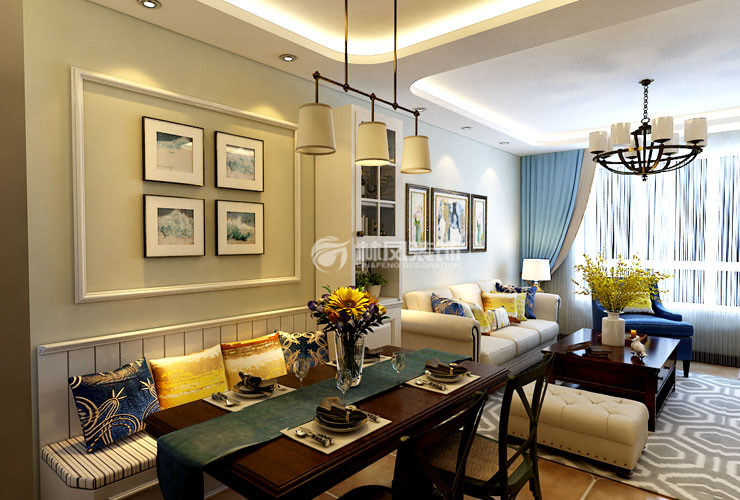 本案戶型客廳主要作用是滿足客戶生活起居,家具上選擇了布藝的沙發(fā),深木色實(shí)木的茶幾、角幾,裝修上采用了弧形造型加上彩色壁紙與石膏線搭配的背景墻設(shè)計(jì),主要目的就是把美式風(fēng)格的一些特點(diǎn)體現(xiàn)出來。