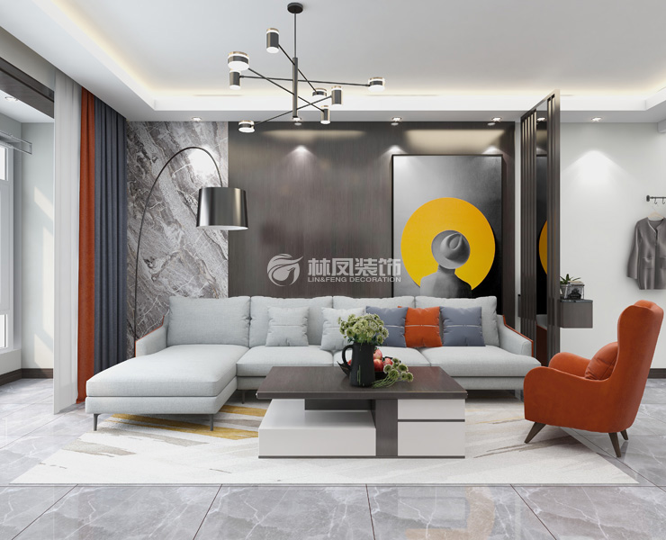 首創(chuàng)國際城118平三室兩廳現(xiàn)代風格林鳳裝飾的客廳采用的是灰色大理石紋理的瓷磚,客廳采用回字型吊頂,內(nèi)側(cè)藏虛光燈槽。電視背景墻是用石膏板做錯縫造型,里面貼壁布。