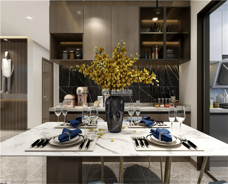 南湖公園150平三室兩廳港式風(fēng)格林鳳裝飾的餐廳采用開(kāi)放式廚房的設(shè)計(jì),餐桌的材質(zhì)為大理石材質(zhì),餐桌旁柜子的柜體為深色系與客廳的主色調(diào)達(dá)成一致。