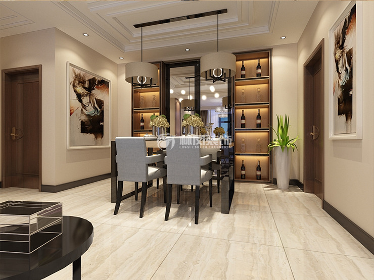 龍湖西府原著145平三室兩廳港式風(fēng)格林鳳裝飾的餐廳門口設(shè)計(jì)酒柜對(duì)稱造型,使得廚房與餐廳更加的渾然一體。