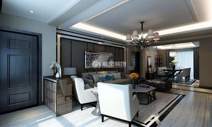 方大御府143平兩室兩廳港式風格林鳳裝飾的客廳選擇了線條感特別強的金屬條來映襯?,F(xiàn)代風味十足的吊燈位居中央。金屬色和虛光柔和在一起韻味十足。高端大氣的大面積灰色地磚。