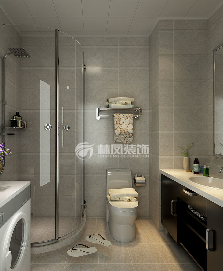 灰色紋理地面磚,配上黑白墻面磚,高端大氣;洗手臺理簡潔,節(jié)省空間、超大手盆方便沖洗,再配上整面鏡面和儲物柜,仿佛衛(wèi)生間大了一倍,空間舒適通透。