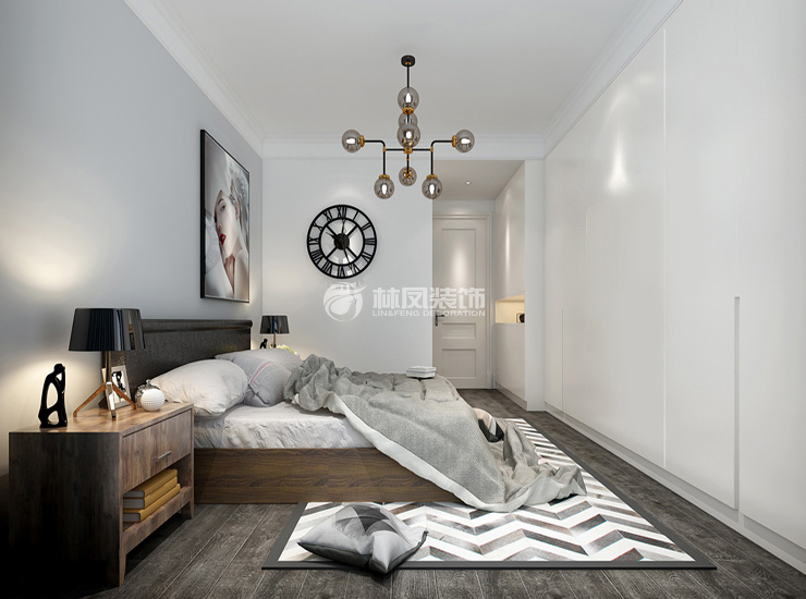 華潤紫云府130平三室兩廳北歐風(fēng)格林鳳裝飾的整體臥室的墻面,同樣采用個(gè)性化顏色,臥室一個(gè)休息的房間,選擇一個(gè)業(yè)主喜歡的顏色,就是對于他們最大的滿足