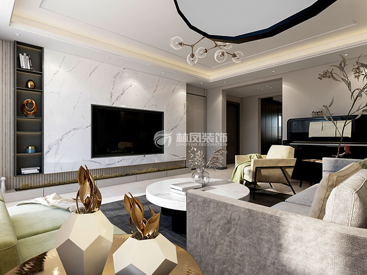 恒大華府180平4居室現(xiàn)代輕奢風(fēng)格林鳳裝飾的客廳電視背景墻做成了大理石形式,奢華而有質(zhì)感,通過設(shè)計(jì)隱形門將次臥室的門完美融合到背景墻的設(shè)計(jì)之中,進(jìn)一步擴(kuò)大延伸了客廳的整體視覺空間,電視背景墻靠窗一側(cè)打造明格形式用來擺放房主的個(gè)人收藏;吊頂上懸掛主燈,利用筒燈與隱藏?zé)魩?,從頂面到立面,制造出一個(gè)比較完整立體的空間。