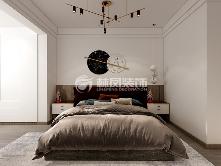 恒大華府180平4居室現(xiàn)代輕奢風(fēng)格林鳳裝飾的次臥位于陽面南側(cè),有著良好的采光與照明,美中不足是有一處較厚墻垛無法拆除。所以在設(shè)計(jì)上,打造定制柜來擴(kuò)大房間內(nèi)的儲(chǔ)物空間,墻面懸掛精美墻飾來配合整體的設(shè)計(jì)風(fēng)格。