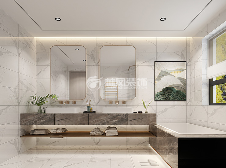萬科明日之光230平三室兩廳新中式風(fēng)格林鳳裝飾的衛(wèi)生間的配色以白色為主簡潔明快,把相對(duì)狹小的衛(wèi)生間通過視覺延伸擴(kuò)大雙手盆的設(shè)計(jì)使空間的使用率達(dá)到最大化,深色的臺(tái)面是點(diǎn)睛之筆。