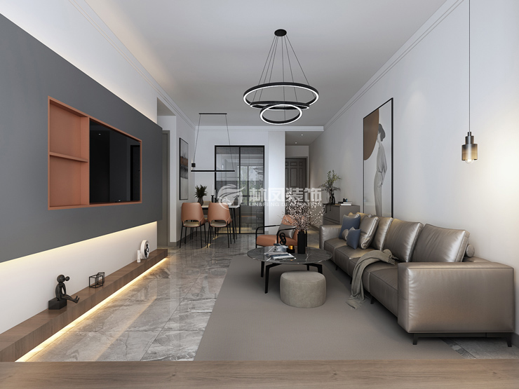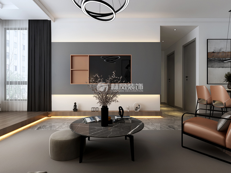 富禹盛京學府113平三室兩廳現(xiàn)代混搭風格林鳳裝飾的客廳整體以白色,木質(zhì)本色,整體顏色的大基調(diào),電視背景墻我們深灰色石膏造型結(jié)合燈帶設計,定制地臺柜及定制電視柜