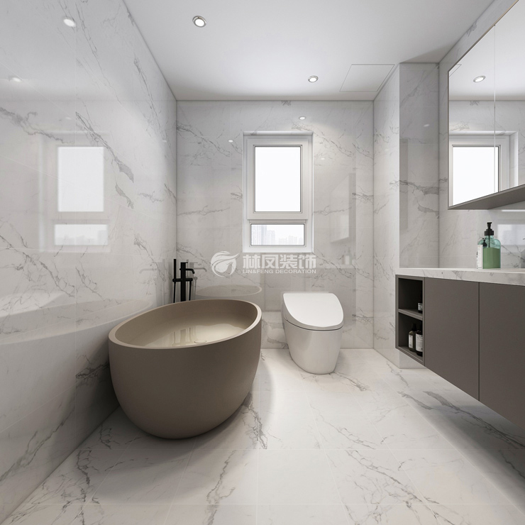 金地樾檀山138平四室兩廳意式簡約風格林鳳裝飾的衛(wèi)生間墻面選用爵士白理石紋墻磚,灰色紋理與白磚的對比明顯,彰顯貴氣。米灰調(diào)兒的浴缸與浴室柜為深色,壓住空間中白色的漂浮感。