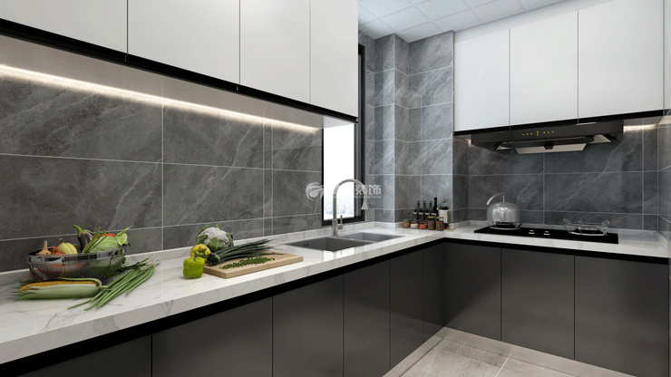 廚房灰色墻磚,上白下黑的柜子搭配是永恒的經(jīng)典,冰箱地位置是業(yè)主最喜歡的設(shè)計(jì),讓廚房增加了很多空間,布局也更合理