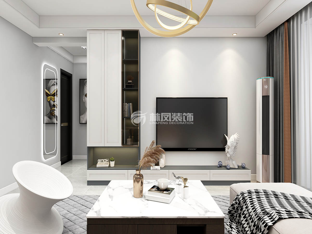 本案客廳整體沒有復(fù)雜的造型,只是在棚面上有一圈邊棚,沙發(fā)背景墻用藍灰色乳膠漆調(diào)色,電視背景墻用組合柜子的形式來代替背景墻,既有裝飾又可以儲物。