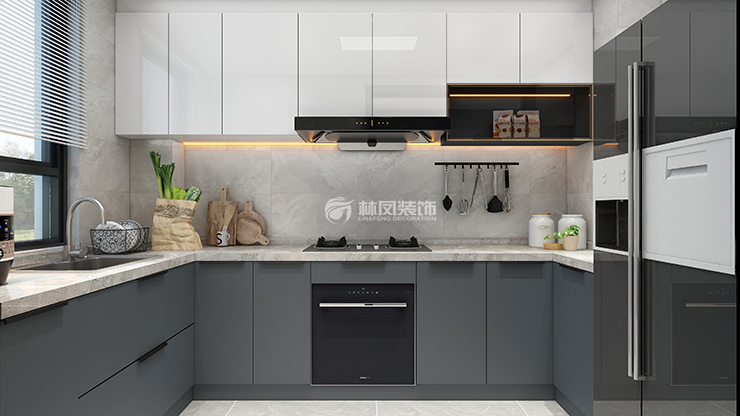 本案是封閉式廚房,基本每天都會做飯,所以選擇的封閉式廚房,深灰色的地柜,淺灰色的上柜,看著干凈利落好打理。
