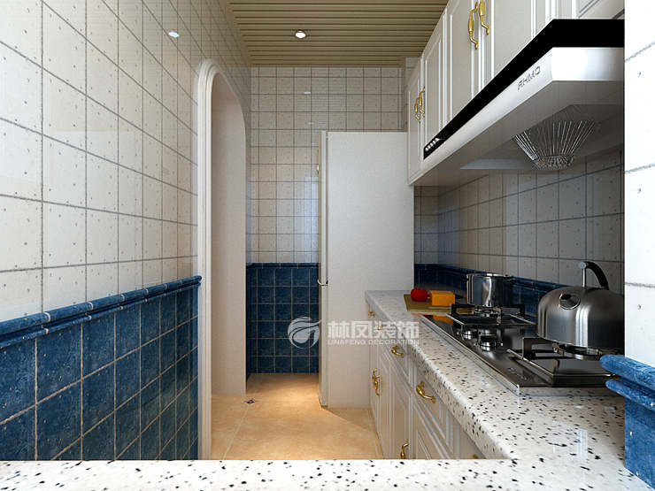 廚房采用了藍(lán)白色的瓷磚和白色柜體,既干凈又有對(duì)比性。