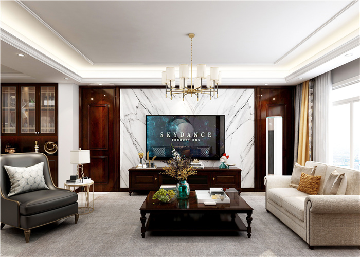 客戶喜歡美式風格,所以選擇了理石背景墻和胡桃木來進行色彩搭配,沙發(fā)選擇的3+2+1式多人沙發(fā),沙發(fā)背景墻選用胡桃木與皮質硬包作為搭配,客廳面積比較大,配合整體效果,墻面設計墻來增加整體圍合感體驗深淺對比,通過家具及軟裝的搭配空間更有飽滿感也更有生活的味道。