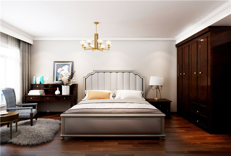 三室兩廳一廚兩衛(wèi),高層整體采用美式風格,色調以深色為主,體現(xiàn)美式的居家感和溫馨感。
