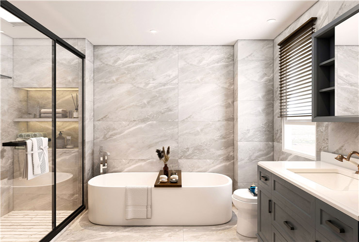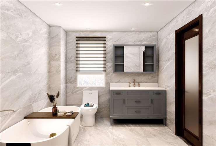 衛(wèi)生間墻面采用了亮灰瓷磚,于是采用了干濕分離,浴房內部做了壁龕,證收納空間,看起來也很美觀,浴缸顯得整體空間寬闊, 洗臉盆采用金色龍頭,體現(xiàn)出顏色合理搭配,顯得衛(wèi)生間簡單大氣。