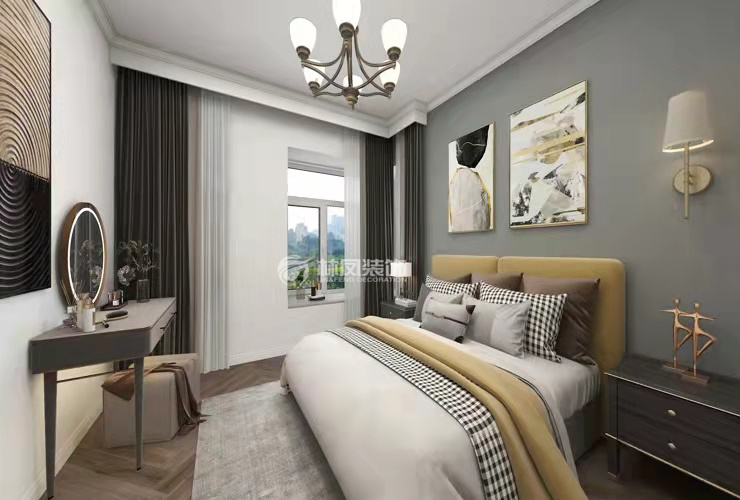 吊棚做石膏角線加主燈比較簡約,做有衣帽間,比較寬敞明亮,臥室鋪設地板與墻面色彩搭配恰到好處,墻面用帶有金屬邊裝飾畫顯現(xiàn)現(xiàn)代輕奢風格,整體效果大氣明亮。